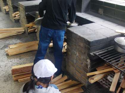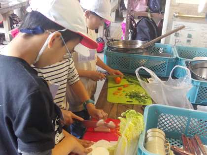 さあ、調理の開始です。調理の道具を運び、薪を用意します。材料を細かに切って、お米を洗ってと、子供たちは協力して自分の役割をしっかり果たしていました。