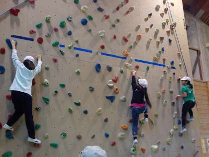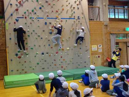 雨のプログラム、「ボルタリング」に挑戦しました。3.5メートルの壁をうまく考えながら登ります。まず、準備運動をして、3つに分かれて登りました。色を決めて登ると、難易度が高くなります。一人4回もチャレンジして、楽しむことができました。