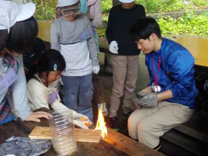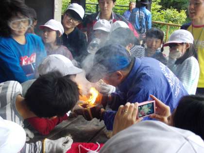 なかなか簡単には火が付きません。友達と交代しながら、百回以上も繰り返して頑張ります。最後に火がついたときには、とても感動して、ワッと歓声が上がりました。本当に貴重な体験でした。