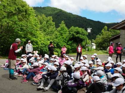 いよいよ登山です。登山の注意を山の家の方に聞いています。虫対策もばっちりです。天気は良好。
