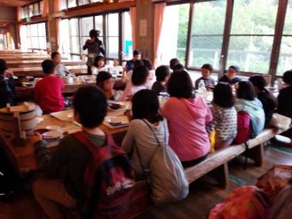 今日は,山でお昼のパンを食べたので、お腹がペコペコです!夕食はたくさん食べていました。クリームコロッケ、おろしハンバーグなど大人気でした。