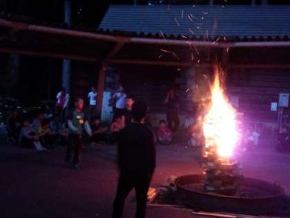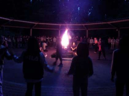 3校合同のキャンプファイヤー。山の家の神様から、協力、挑戦、感謝の3つの火をもらい薪に灯火されました。歌、ダンス、ゲームなど各学校から出し物があり楽しい時間を過ごしました。紫明、元町の友達とすっかり仲良くなりました。