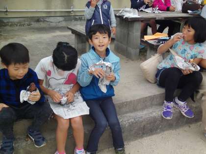 全てのコースのチャレンジが終わったらランチタイムです。チャレンジ前に作った焼いもをみんなでいただきました。地域の方がほくほくに焼いてくださっって,とってもおいしかったです。