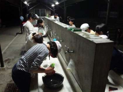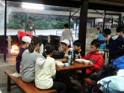 すき焼き風煮の完成です。味付けもばっちり。おかわりをしています。食べた後は、後片付けも頑張ります。