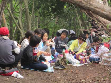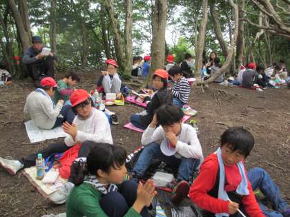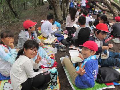 やっと山頂につきました。おにぎり弁当を班ごとに食べます。がんばって登ってきた山頂でのおにぎりの味は,格別です。