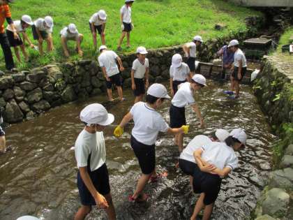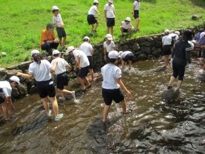 冷たい谷水が流れ込むおがま池に入って,「イワナ」を追いかけます。素早く泳いで逃げる「イワナ」を思うようにはつかまえることができません。