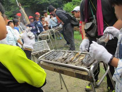 自分でつかまえた「イワナ」を塩焼きにします。命をいただくことについて考えながら,さばいてひらいて,焼きます。