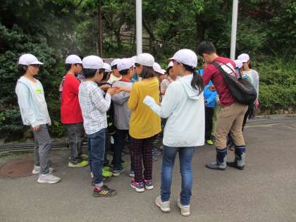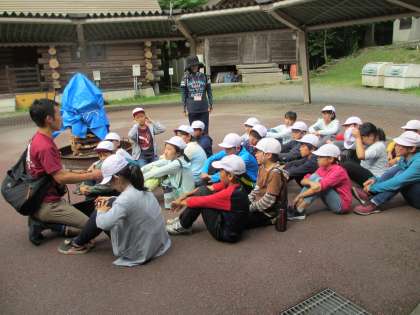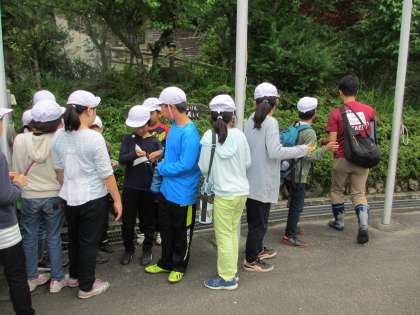 山の家の所内の自然について,いろいろと教えていただきながら歩いて回ります。