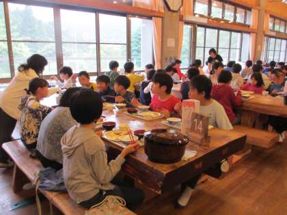 山の家で食べる夕食もこれが最後となりました。夜のキャンプファイヤーに備えてしっかり食べています。