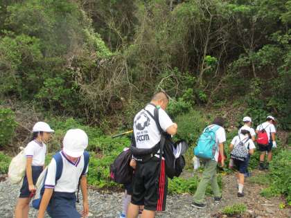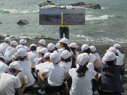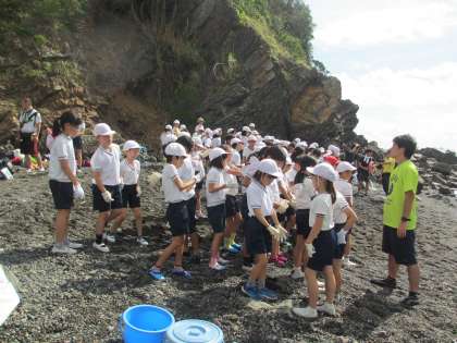 宮崎浜で磯観察をしました。明日見学するマリンランドの方から,干潮時と満潮時の磯の様子の違いを教えていただいたり,実際にヒトデを観察したりしました。
