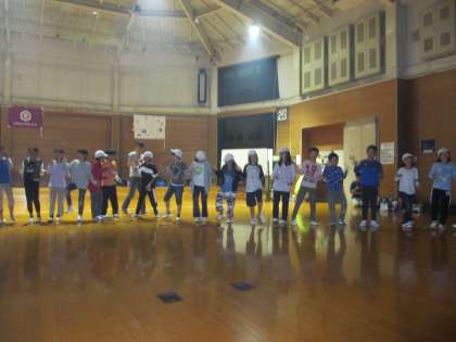 急な雨に備えて,プレイホールでキャンプファイヤーをしました。レクリエーション係を中心に,紫明小学校の4年生と楽しくゲームをしたり,歌やダンスをしたりして楽しい時間を過ごすことができました。