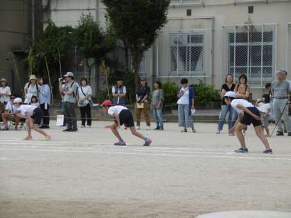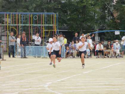 徒競走。低学年の一生懸命でかわいらしい走りから高学年の勢いのある走りまで。見ごたえがありました。