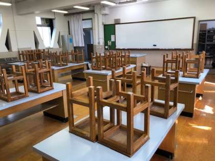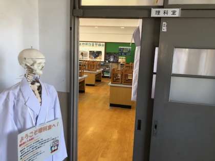 紫竹小学校の理科室です。階段を上ると,入り口で人体骨格模型がお迎えしてくれます。理科室には,普段見られないものが多く,行くたびにドキドキする人もいますが,いつも見られる場所に置き,見慣れることで安心感をもち,「怖い所」から「学習する所」という意識をもってほしいと思っています。