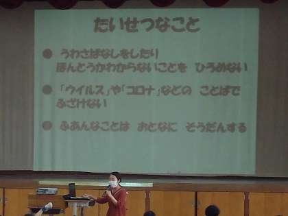 目に見えないものへの恐怖や不安に対しては,「正しく知ること」や「うわさに惑わされないこと」「周りの人との感染防止を踏まえたコミュニケーション」「心がリラックスできるようなことをする」など,色々な対処の仕方があることをみんなで学びました。