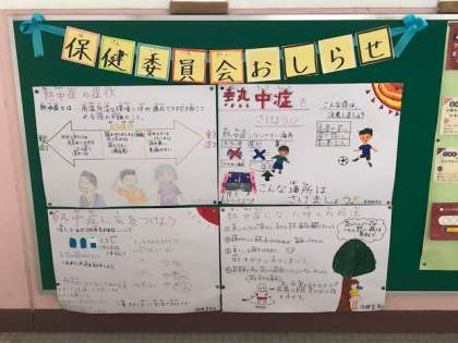 保健室前の掲示板に,保健委員会の子どもたちが「熱中症」について作成したポスターを掲示しました。