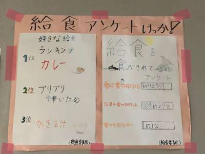 「わたしの好きな給食がランクインしてる!」「ぼくもこのメニューすきやなあ」と,アンケート結果をみながら楽しくお話しています。