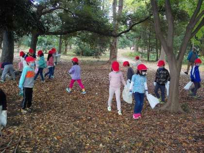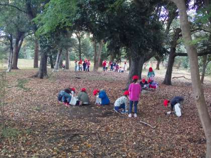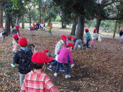 御所では,どんぐりの他に,まつぼっくりや銀杏の葉など,秋の宝物をたくさん見つけることができました。袋がいっぱいになり,破れそうになっている子もいました。