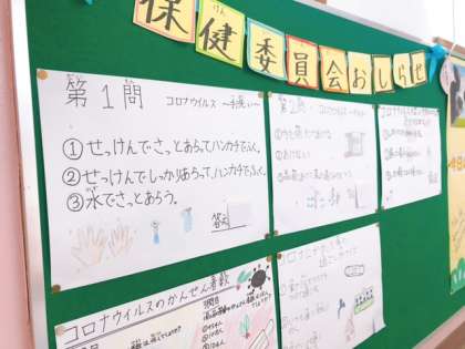 「みんなが元気に過ごすためにはどうしたらいいかな?」と児童保健委員会で話し合い,掲示物での呼びかけを行っています。