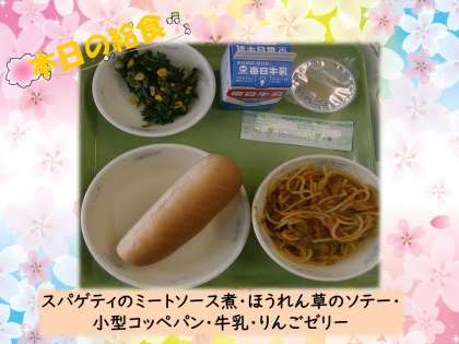 令和3年度最初の給食は,みんな大好きな「スパゲティのミートソース煮」でした。1年生をお祝いする献立です。りんごゼリーもついていて,1年生も大喜びでした。