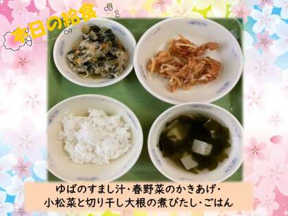 今日はなごみ献立でした。「春野菜のかきあげ」は,春においしい野菜を使ったかきあげです。「お野菜苦手。」と言っていた1年生も,「食べてみたらおいしかった!」とうれしそうに伝えてくれました。「ゆばのすまし汁」は,「おかわりほしい〜。」と手をあげる子どもたちがたくさんいました。だしのうまみと柔らかいゆばの食感が最高においしかったです。