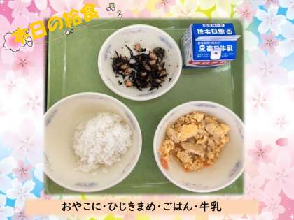 今日は親子煮をいただきました。ふわふわの卵の食感と柔らかく煮たにんじんや玉ねぎが出しのうま味と相まって,ごはんが進みました。