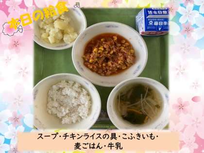 今日の給食は,こどもの日にちなんで,みんなが大好きな「チキンライス」でした。