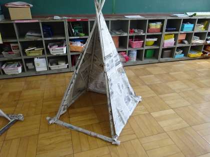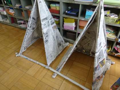 図画工作科の学習で,新聞紙を使ってテントをつくりました。新聞紙を重ねて棒状にしたものを骨組みにしてつくりました。棒状に細くするのに,少し苦戦していましたが無事に一人一つのテントを完成させることができました。