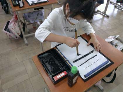 筆を墨につけるのにも緊張していた子どもたちですが,いろいろな太さや形の線を書いて楽しんでいました。