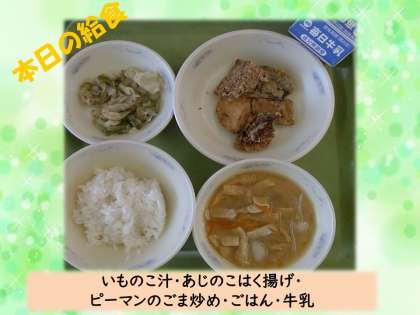 今日は「あじのこはく揚げ」をいただきました。「あじ」は,味がよいから「あじ」と呼ばれるほどおいしい魚です。春から夏にかけてとれるあじは,脂がのっていて特においしいです。また,体をつくるたんぱく質や骨や歯をつくるカルシウムが多く含まれていて栄養満点です。