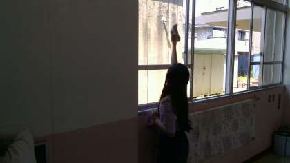 廊下を奥に進むと,背の届きにくい高さの窓はジャンプしてでも拭こうと頑張っている5年生を発見。心がほっこりしました。