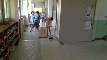 今日は1階の様子をご紹介します。1階玄関前廊下は,5年生の掃除場所です。すのこをずらして,下にたまった砂をしっかり掃除している5年生。ごみ捨てに通る1年生も,その姿をしっかりと見ていました。