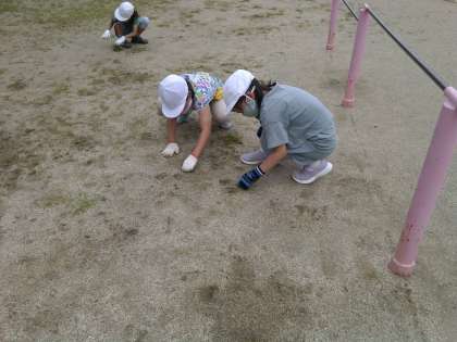 例年5月30日を「ごみぜろ」の日の語呂合せで草引きをしていましたが,今年度は緊急事態宣言により延期していた取り組みを,学年ごとに実施しています。今日,3年生はてつぼう周辺の草引きを行いました。抜いた草を,しっかり土を落としてゴミ袋に入れていました。3年生の子どもたちのおかげで,てつぼう周辺が見違えるようにきれいになりました。