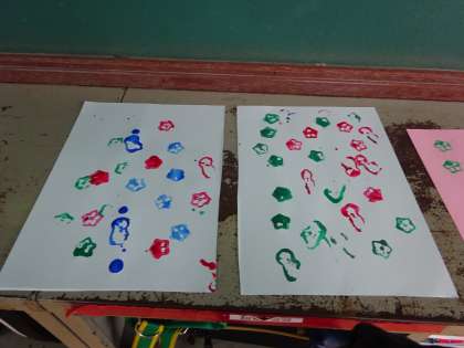 たいよう学級では,ピーマンやオクラがたくさん収穫できています。今回は自分たちが育てた野菜を使って,スタンプ遊びをしました。切り口がどんな形になるかを予想してから,活動しました。子どもたちは,「オクラは星みたい」「ピーマンは面白い形だな」ととても楽しそうにスタンプしていました。もっとやりたいと2枚,3枚とたくさん作品ができました。