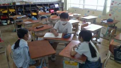 本年度最初のたてわり活動を行いました。5,6年生が,1,2年生を迎えに行き,グループで集まりました。この日は,メンバーの自己紹介と今後の活動について話し合いました。