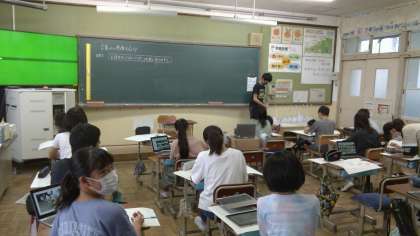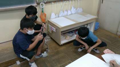 図画工作科「言葉から想像を広げて」で,お話を聞き,自分が想像したイメージを絵に表す学習をしています。人間の動きを絵に表すのに,難しい体勢や動きをGIGA端末で撮影し,その写真をもとに絵に表しています。
