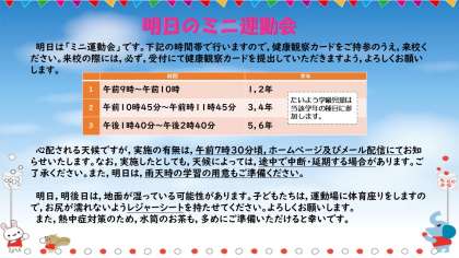明日はミニ運動会です。天候が心配されます。本日配付いたしましたプリント,及びホームページをご覧いただき,明日以降の準備など,よろしくお願いいたします。