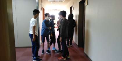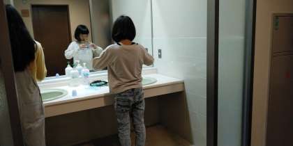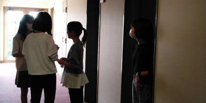 起床後、布団を片付け、洗面をすませて、検温です。特に体調のすぐれない子どももなく、元気です。