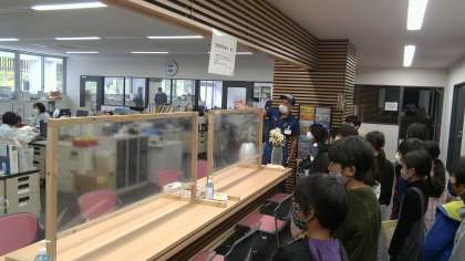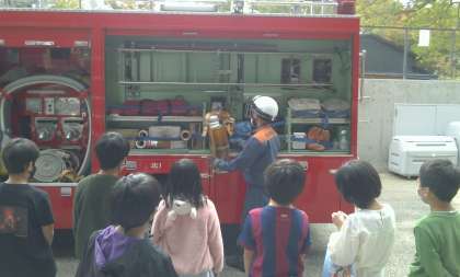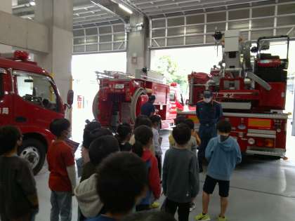 実際に,お仕事をされている部屋に案内してもらったり,消防車を見たりしながら説明を聞きました。消防車にもいろいろな種類があり,ホースの長さや,積んでいる水の量,はしごの高さなど,実際に教えてもらって驚きの声がたくさんあがりました。