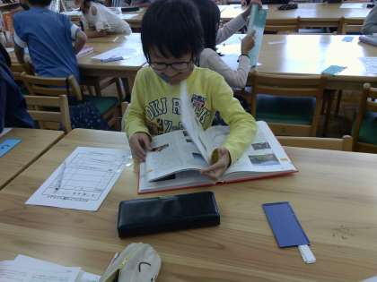 それぞれにクイズカードが配られ,『ポプラディア』で調べていました。