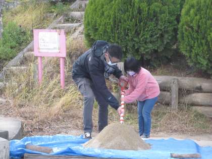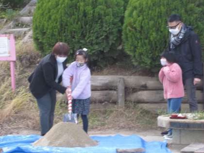 運動場では,井戸掘りの鍬入れ式で地域の皆さんやPTA会長さん,校長先生,子どもたちも参加し,これから行われる井戸掘りの安全を祈願されました。