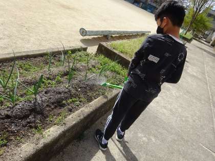 たいよう学級では,畑でたまねぎとじゃやがいもを育てています。朝の会の終わりに,大きく育ってねと願いを込めて,水やりをしています。