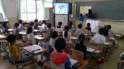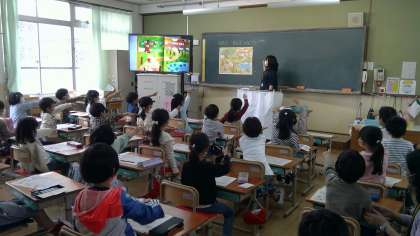 算数の学習が始まっています。教科書の絵を見ながら,動物さんが何をしてるかお話したり,線でつないだりしていました。