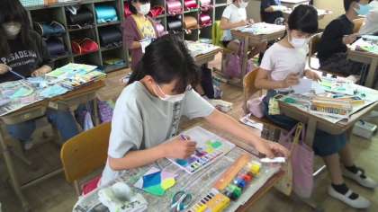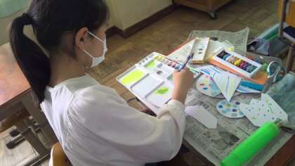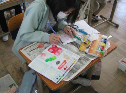 図画工作で,自分の思うままに絵の具で色や形を描いています。パスや絵の具,クーピーなど,様々な描画材を組み合わせて,楽しく図画工作に取り組みました。どんな作品が出来上がるか楽しみです。