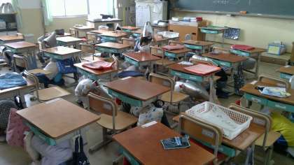 訓練の放送が入ると,みんな真剣に聞き入り,次に,机の下に入って頭を守りました。1年生も,練習通り,素早く防災頭巾を被ることができました。
