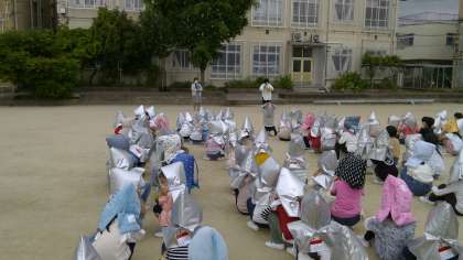 全校児童が運動場に集合するまで4分間でした。避難した後,校長先生のお話を聞きました。