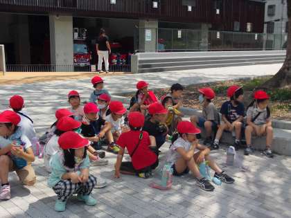 熱中症対策のため,マスクを外して話すのを控えながら歩きました。2年生の子どもたちは,きちんとルールを守りながら歩き,校区のすてきなところを見つけていました。写真は,お茶休憩をしている時のものです。