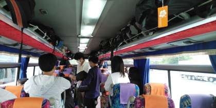 2回目のトイレ休憩を吉備でとりました。傘をさすほどの雨では、ありません。今のところバス酔いをする子もなく、元気です。