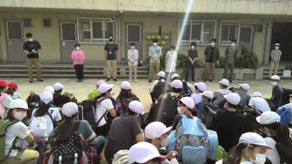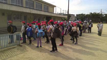 出発式では,代表児童の言葉,引率する教職員紹介,校長先生のお話がありました。最後に,朝から見送りに来てくださった保護者の方々に「行ってきます」のあいさつをしました。