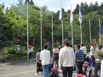 花背山の家に到着。お天気も良く、学校より少し涼しく感じます。全員元気にそろって山の家の方にあいさつをして、校歌にあわせて校旗をあげます。
