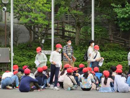 本館前に集まって、朝の集いを行いました。健康かんさつをすませて、今日の活動の流れを確かめました。今日は野外炊事があります。グループで力を合わせて、おいしい昼食を作ります。